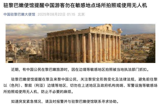 8月22日,驻黎巴嫩使馆提醒中国游客勿在敏感地点场所拍照或使用无人机。驻黎巴嫩使馆称,近期,有中国公民在黎巴嫩旅游时,因在边境等敏感地区拍照被当地执法部门抓扣。