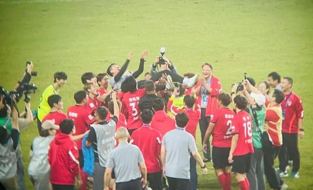 9月27日晚,苏超常规赛最后一轮,淮安队0:0战平徐州队,比赛结束后,球员们将主教练董松抛起庆祝。国是直通车 段修健 摄