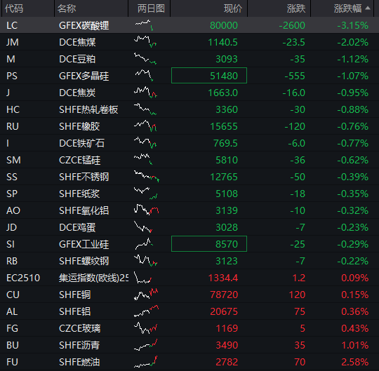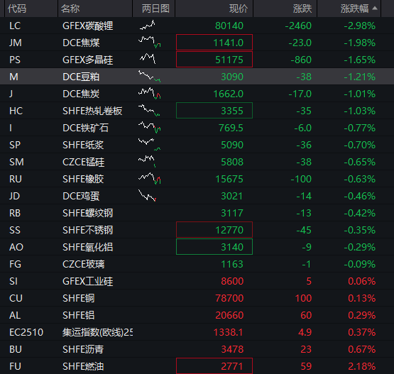 商品:国内商品期货多数走低,截至发稿,碳酸锂跌超3%,焦煤跌超2%,豆粕、多晶硅跌超1%,焦炭、热卷板、橡胶、铁矿石、锰硅、不锈钢、纸浆、氧化铝、鸡蛋等下跌,燃油涨超2%,沥青、玻璃、铝、铜等走高。![]()