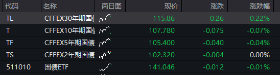 债市:国债期货全线下跌,截至发稿,30年期主力合约跌0.22%,10年期主力合约跌0.07%,5年期主力合约跌0.04%,2年期主力合约持平。![]()