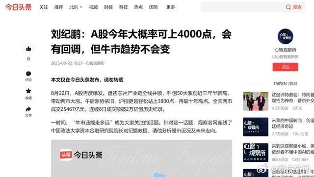 “谁知股中味,盘点皆是泪。”2025年8月22日,上证指数以3825.76点收盘,稳稳站上3800点、创10年来新高之际,沉浸股市20多年的西安资深股友王先生感叹说。