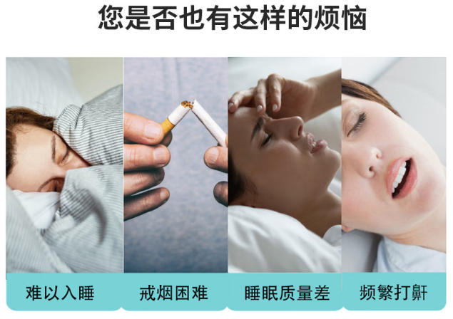 关于商品的适用场景,不少店铺直接在页面详情处作出文字图片等暗示,“产品可用于缓解失眠、辅助戒烟、改善睡眠质量、减轻睡觉打鼾等问题。”