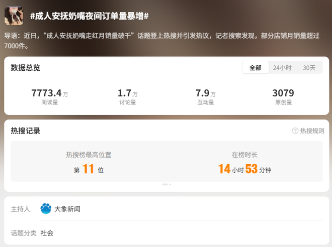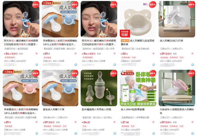 近期,#成人安抚奶嘴夜间订单量暴增# #成人安抚奶嘴销量火爆# 等话题一度登上微博热搜,并引发热议。