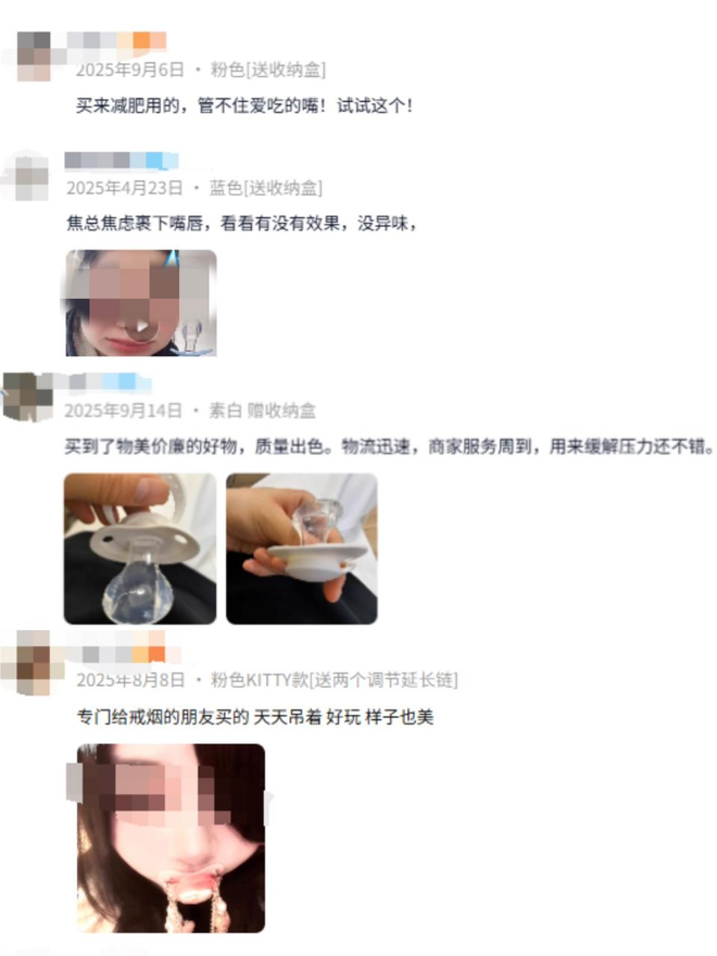 除了缓解压力、焦虑,在电商平台的成人奶嘴商品页用户评价栏,记者看到不少用户表示,其购买成人奶嘴用于减肥、戒烟、防磨牙等。