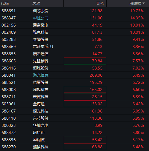 半导体板块继续拉升,灿芯股份逼近20CM涨停,华虹公司涨超15%,雅克科技、通富微电、赛腾股份等纷纷跟涨。