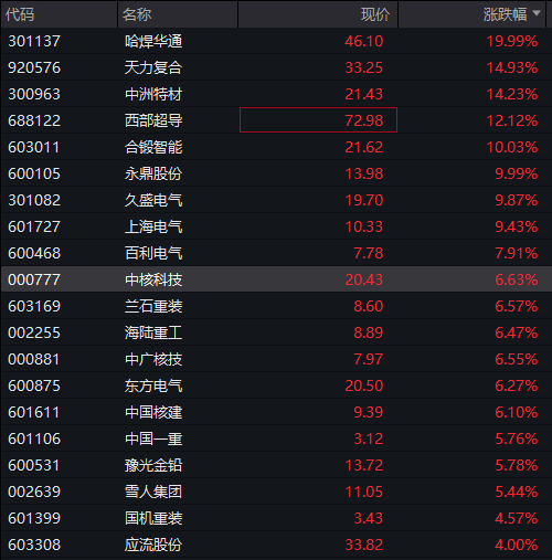 A股可控核聚变板块持续走高,合锻智能、永鼎股份涨停,哈焊华通、天力复合、常辅股份涨超10%,上海电气、中洲特材、浙富控股、西部超导、国光电气等跟涨。