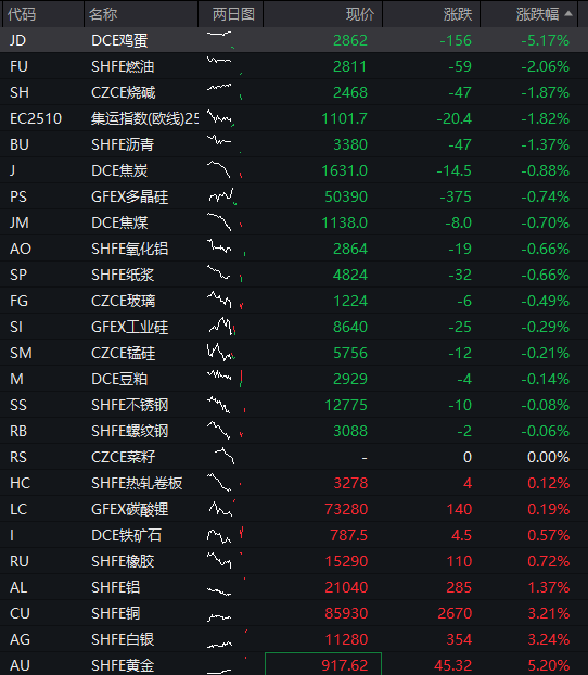 商品:国内商品期货多数下跌,截至发稿,鸡蛋跌超5%,燃油跌超2%,烧碱、集运指数、沥青跌超1%,焦炭、多晶硅、焦煤、氧化铝、纸浆、玻璃、工业硅、锰硅、豆粕等纷纷下跌,沪金、沪银逆势大涨,其中沪金涨超5%。![]()