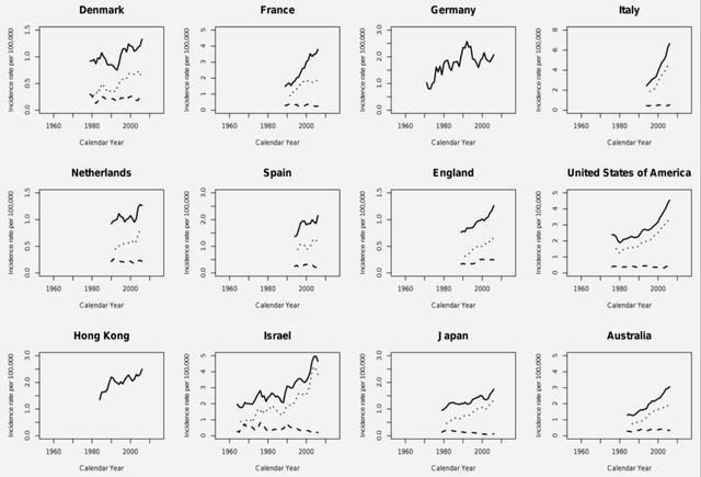1960 年至 2007 年,在不同国家和地区,男性甲状腺癌发病率的总体趋势呈明显上升,图片