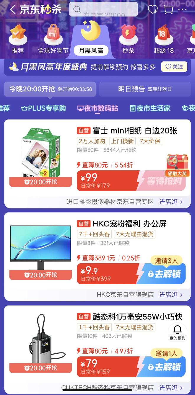 当晚7点50分就已蹲守在京东App的李木(化名)告诉时代财经,他看到月黑风高频道下有多款商品折扣低至1~3折,已提前把几件心仪商品加入购物车。“最想抢的是一款拍立得相纸,原价179元,折后99元,还提前在直播间抢到红包”。没想到8点一到,场面过于火爆,仍与之失之交臂。到了9点50分,其又参与了一轮耳机的抢购,不过仍未抢到。“只能蹲蹲看明天了。”他说。