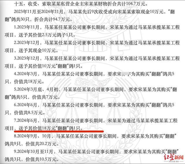红星新闻记者注意到,马某某收受的110万金钱中,有马某某主动索取的,也有行贿者主动送的。但其收受的95只“翻翻鸽”中,几乎都是他主动向管理对象索取的。在送鸽的人中,私营企业主宋某宇出手最大方,其送给马某某“翻翻鸽”30只,价值94.7万元,其中价值18万元1只、价值10万元1只;送鸽子最多的是一矿业有限责任公司采矿队队长卢某某,其在2023年3月、4月两个月内,送了马某某48只“翻翻鸽”,最多的一次送了28只。