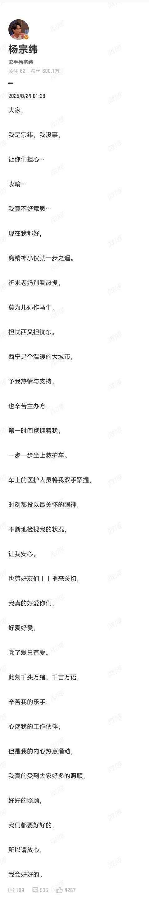8月24日凌晨,杨宗纬发声报平安:
