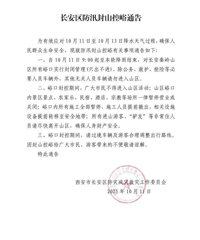 10月11日,西安市长安区、鄠邑区、蓝田县发布封山控峪公告。