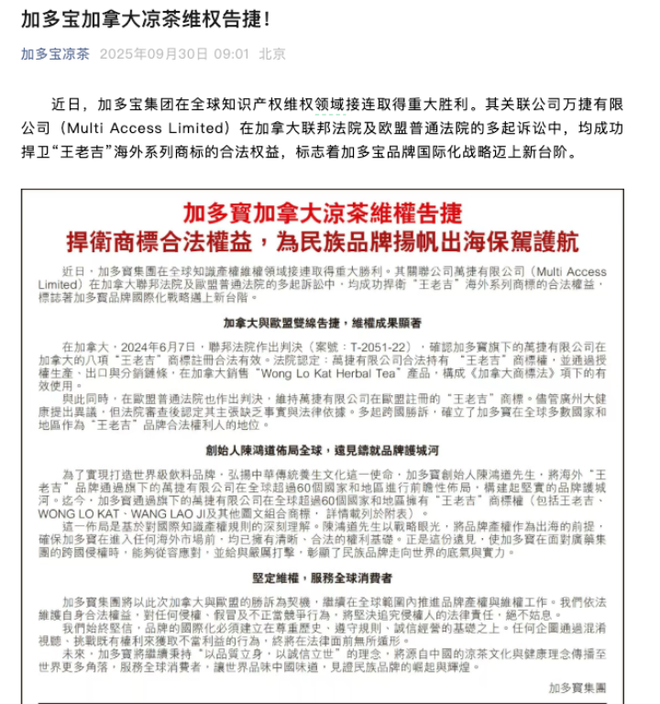 据加多宝9月30日发布的文章,其关联公司万捷有限公司(Multi Access Limited)在全球超60个国家和地区拥有“王老吉”商标权,并在加拿大联邦法院及欧盟普通法院的多起诉讼中“成功捍卫‘王老吉’海外系列商标的合法权益”。