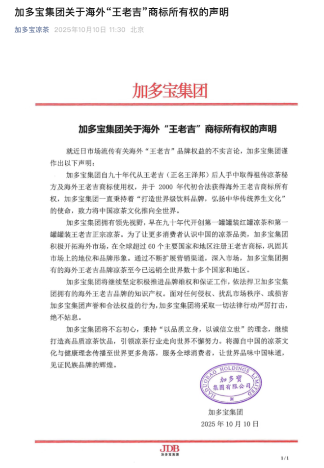 今日(10月10日)上午,加多宝集团在其官方微信公众号发布《关于海外“王老吉”商标所有权的声明》,称加多宝已在全球60多个主要国家和地区注册王老吉商标。