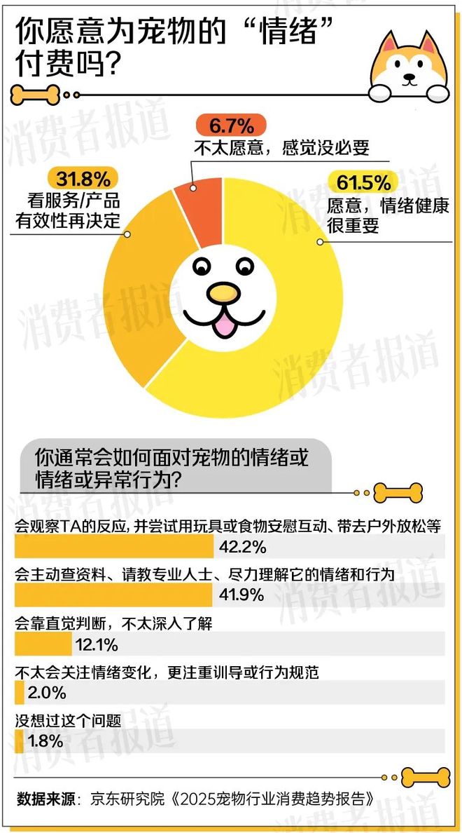 除了照顾它们的身体,与当代人越来越重视“情绪”趋势一致,人们对于宠物心理健康的关注度也在不断提升。京东研究院发布《2025宠物行业消费趋势报告》显示超四成养宠人主动关注、理解宠物情绪,并通过玩具、食物安慰互动、带去户外放松等方式缓解宠物情绪,超六成人愿意为宠物的情绪付费。