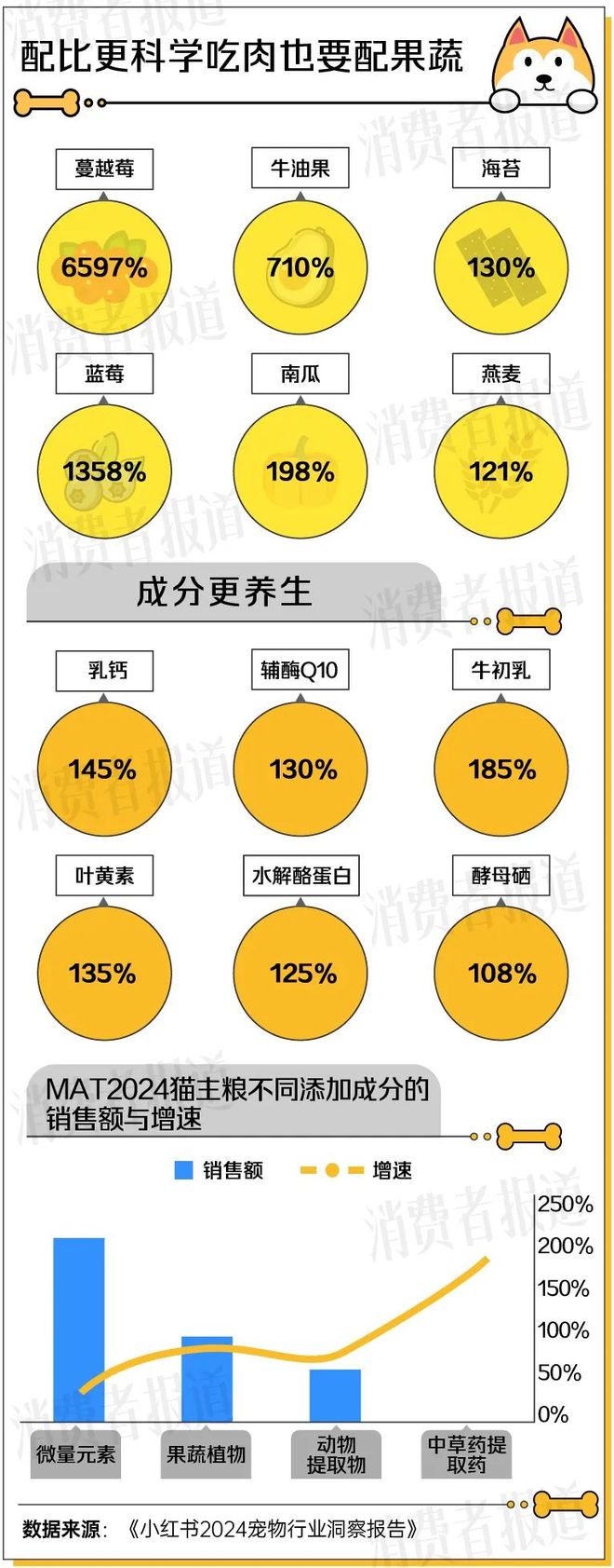 《小红书2024宠物行业洞察报告》显示,2024年,含有蔓越莓(+6597%)、蓝莓(+1358%)、牛油果等天然果蔬的主粮销量表现亮眼,叶黄素、辅酶Q10这类营养成分也成为“常客”,配料的多元升级推动主粮市场进一步细分。