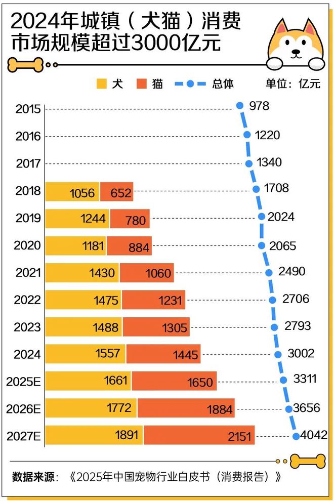 巨大的需求令宠物经济迎来爆发性增长。《白皮书》数据显示,2024年城镇(犬猫)消费市场规模增长7.5%,达到3002亿元。其中,犬消费市场规模同比增长4.6%;猫的市场规模增长更为显著,达到10.7%。单只猫狗的年均消费超过2000元,均呈现出增长态势。