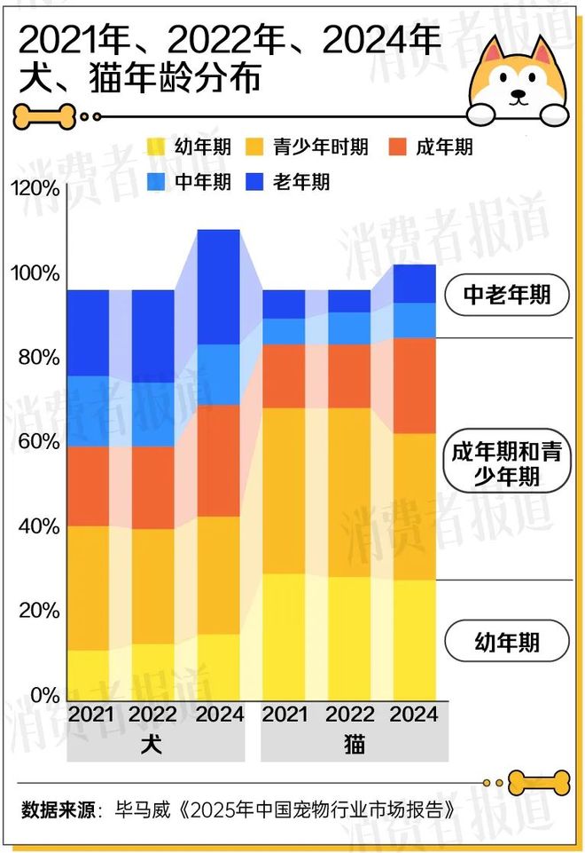 除了宠物生时需要更好的生活,当所爱远逝,如何进行最后的道别,是每一个养宠人最终会面对的问题。《市场报告》显示,我国青少年时期犬、猫数量最多,但同时也面临高龄宠物越来越多的情况,其中2024年老年犬占比达27.6%,较2021年增长6.4%,老年猫占比则由2021年的6.3%升至2024年的10.1%。