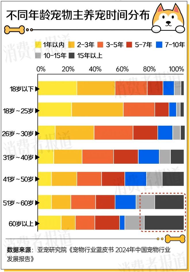 这一定程度上与他们的宠物大多是高龄宠物有关。亚宠研究院发布的《宠物行业蓝皮书2024年中国宠物行业发展报告》显示,养育一只宠物超过10年以上的宠物主,51岁及以上的占比最高。