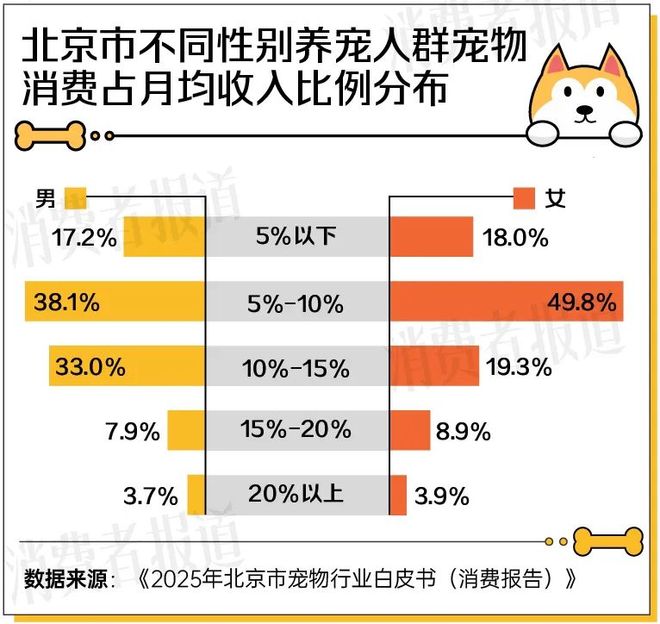 与此同时,从支出占比来看,男性更倾向于高消费。上述报告显示,33%男性将月收入10%~15%用于宠物消费。