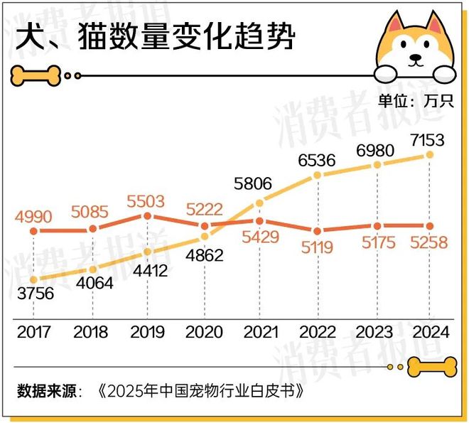 “年纪轻轻,猫狗双全”成为不少年轻人的梦想生活。但现实是,精力、财力都有限,养猫还是养狗,只能进行“极限二选一”。不过从数据来看,近年来,猫咪已经超越狗狗成为都市人热衷的宠物。《白皮书》显示,2019年开始,宠物猫的数量快速增长,并从2021年开始连续超过狗的数量。2024年,宠物猫数量达到7153万只,宠物狗数量为5258万只。