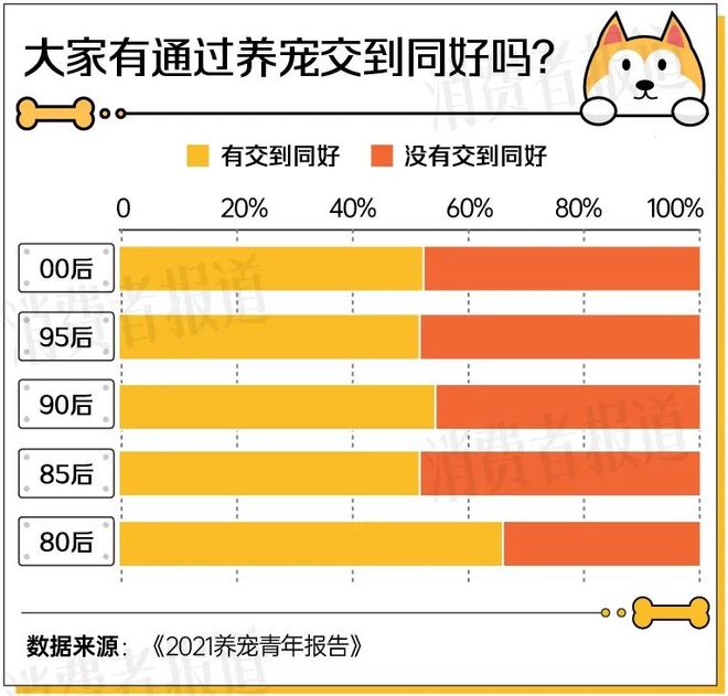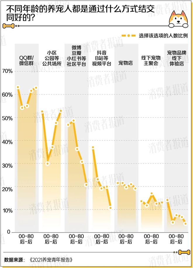 除了对内探索,宠物也成为了当代人与世界产生连接的一种方式。DT财经联合未卡发布的《2021养宠青年报告》显示,各年龄段都有超过半数人通过宠物交到同好。其中,80后通过宠物交到同好的比例最高,超过6成。整体来看,线上社交平台如QQ群、微信群、微博、豆瓣和小红书,是大家互相连接的主要场所,其次是线下不同的场所,如小区楼下、公园等公共场所等。