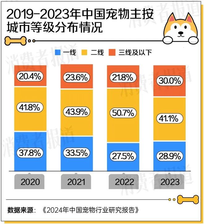 养育它们的大部分是生活在城市的年轻人。白皮书指出,2024年90后仍然是养宠主力军,占比41.2%。00后占比显著提升,从2023年的10.1%增长到了2024年的25.6%。从宠物主的城市分布来看,艾瑞咨询发布的《2024年中国宠物行业研究报告》显示,70%的宠物主集中在一二线城市。不过,或许是受到下沉市场消费力提升以及一线城市对于养宠限制趋于严格,从而降低了养宠意愿等因素影响。多项调研数据指出,一线以及新一线城市养宠人群占比呈现下降趋势,三线城市呈上升趋势。