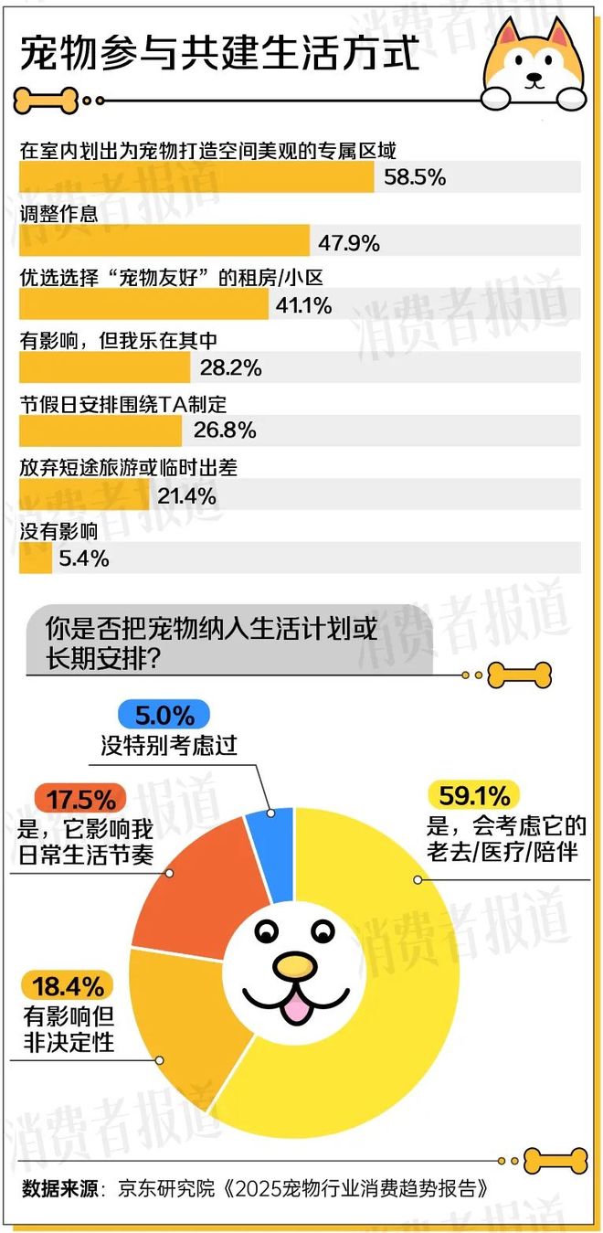 这使得养宠人格外珍视宠物的生活质量,希望它们在快乐、健康与充沛的爱中度过短暂的生命。京东研究院发布《2025宠物行业消费趋势报告》显示,近六成养宠人会将宠物纳入长期生活安排,考虑其未来的老去、医疗、陪伴等因素,养宠正成为长期规划中的一部分。“为宠物改生活方式”也正在成为一种普遍现象:58.5%的养宠人会在室内为TA打造专属空间,并将空间的美观程度纳入家庭整体环境的考量,47.9%的人调整了作息节奏,41.1%的人在搬家时优先选择“宠物友好型”租房小区,甚至有用户表示“节假日的出游路线都得提前替TA安排好”。