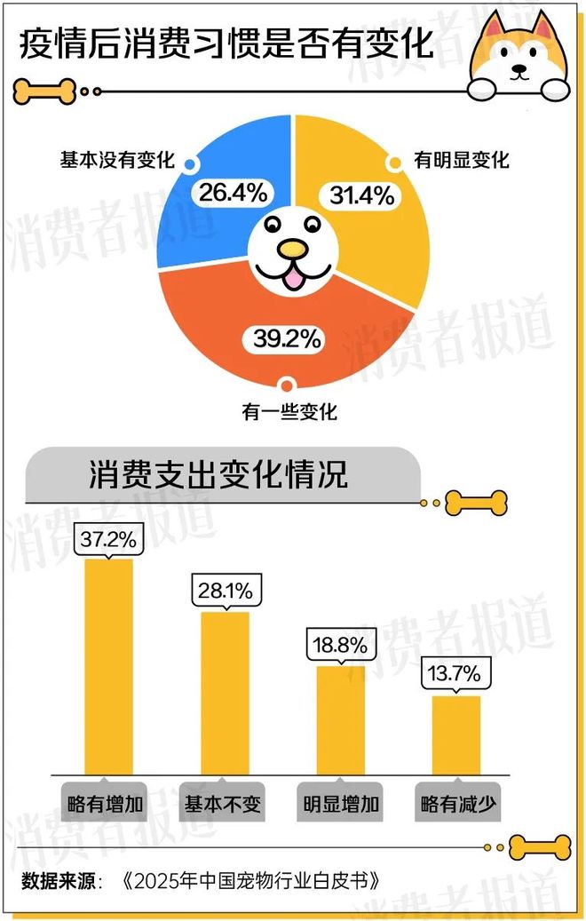 其中,18.8%的宠物主认为消费支出明显增加,37.2%的宠主认为消费支出略有增加,只有13.7%的宠物主消费支出略有减少。