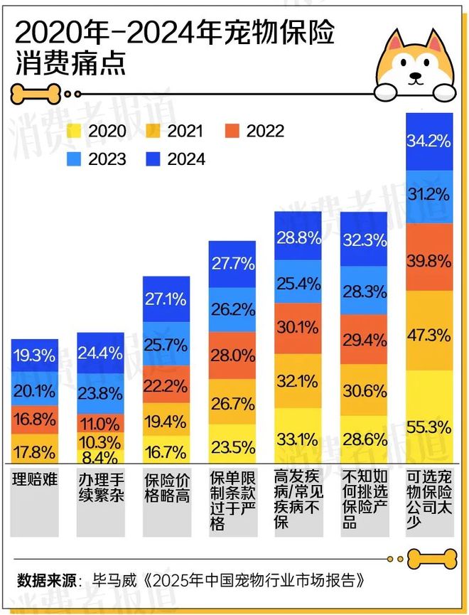 为了保证宠物的健康,宠物医疗与保险需求同样增长。众安保险数据显示,2024年宠物险总保费规模同比增长达到129.5%。不过《市场报告》显示“销售宠物保险的公司太少”“不知如何挑选保险产品”是困扰广大养宠人的主要问题,关注度均超过30.0%,其次就是一些高发疾病或常见疾病未纳入保单的问题,占比达到28.8%。