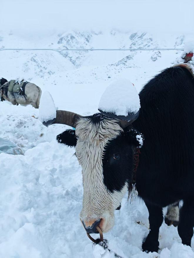 海子告诉时代财经,一头牦牛一般可以负重80公斤。但暴雪让路况发生变化,负重的牦牛无法正常在积雪中行走,加之山上野草被大雪掩埋、牦牛面临食物短缺,为此许多牦牛工都选择先放下徒步者们的行李,及时撤离下山。