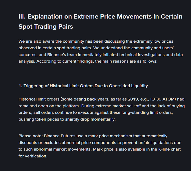 币安对此也给出了技术层面的解释。公告指出,主要原因有二:首先,由于市场出现单边流动性枯竭(缺乏买单),抛售订单持续执行,最终触发了平台上一些“历史悠久的限价单”,其中部分订单的设置时间可追溯至2019年,其极低的价格导致了代币价格瞬间暴跌。
