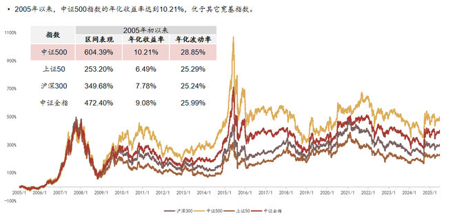 从历史表现来看,2005年以来,中证500上涨604.39%,年化收益率10.21%,从收益表现上看优于其它大盘宽基指数,波动性则略高于其他大盘宽基指数。