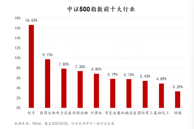 行业配置均衡,是中证500指数的特色与优势。中证500指数前十大行业中既包含电子(16.63%)、医药生物(9.73%)、电力设备(7.85%)、计算机(6.85%)等新经济行业,也囊括非银金融(7.36%)、有色金属(5.79%)、机械设备(5.76%)、基础化工(4.89%)等传统行业。(数据来源:Wind,截至2025/8/29,行业采用申万一级行业分类)
