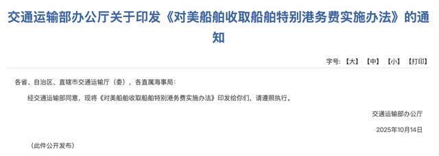 14日,交通运输部发布《对美船舶收取船舶特别港务费实施办法》。