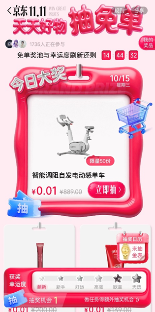 本次免单活动持续加码,大牌爆款轮番上阵,通过精心打造的“免单福利日历”,不断为消费者带来层层惊喜:10月16日,价值1799元麦瑞克家用椭圆仪,助力高效居家健身;10月20日,价值3600元蔻驰COACH托特包,用精致皮革塑造高级感;10月30日,价值3980元CRASH BAGGAGE意大利凹凸行李箱,为差旅行程增添个性品味;11月2日,价值3535元CRANSTON R 9折叠自行车,便携设计引领都市骑行风尚;11月3日,价值5000元天梭PR100女表,以经典设计点缀职场优雅;11月10日至11日,更将重磅抽出24K黄金真钻瑞士金表、SK-Ⅱ神仙水、Lee棉服等压轴爆品,将免单狂欢推向高潮。