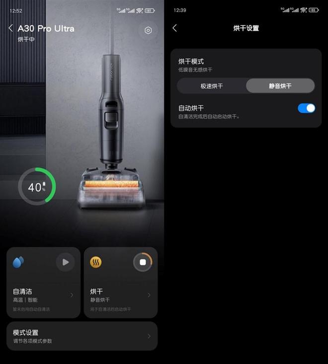 石头智能洗地机A30 Pro Ultra的自清洁完成之后,烘干模式在APP中也可以选择两种不同的烘干模式。
