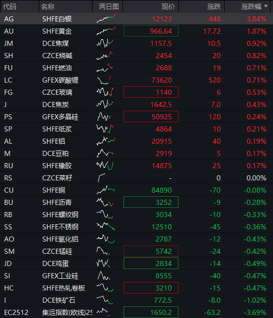 商品:国内商品期货多数上涨,截至发稿,沪银涨超3%,沪金涨超1%,焦煤、烧碱、燃油、碳酸锂、玻璃、焦炭、多晶硅、纸浆、铝、豆粕、橡胶等上涨,沥青、螺纹钢、不锈钢、氧化铝、锰硅、鸡蛋、工业硅、热卷板等下跌,铁矿石跌超1%,集运指数跌超3%。![]()