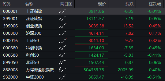 A股:截至发稿,沪指跌0.01%,深成指跌0.05%,创业板指涨0.45%。![]()