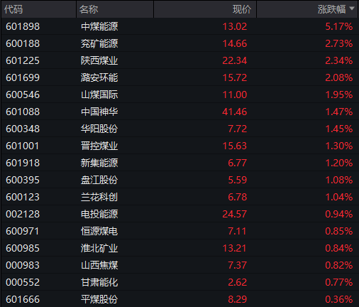 煤炭板块反复活跃,大有能源5天4板,中煤能源、电投能源、晋控煤业、昊华能源、兖矿能源等跟涨。