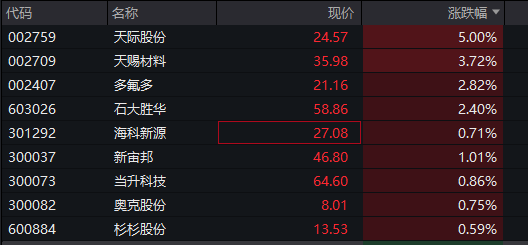 早盘锂电池概念异动拉升,电解液方向领涨,天际股份一度走出9天6板,天赐材料、多氟多、石大胜华、奥克股份跟涨。