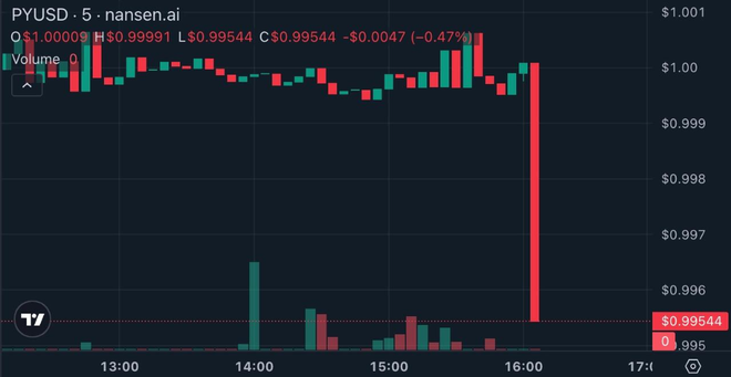 据Nansen数据,PYUSD在事件发生后维持了美元锚定,价格仅短暂下跌约0.5%。