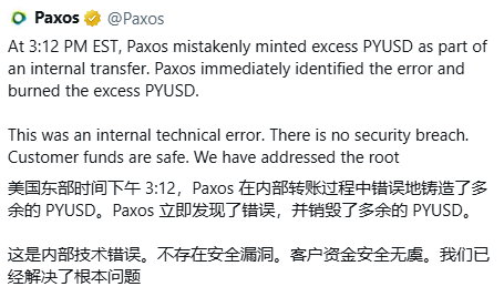 Paxos随后在声明中表示,这是"内部转账过程中错误铸造了过量PYUSD",属于内部技术错误,不涉及安全漏洞,客户资金安全。该公司称已解决根本原因。