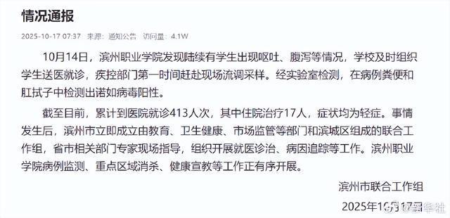 滨州职业学院多名学生出现呕吐腹泻症状,检出诺如病毒阳性,累计就诊413人次,其中17人住院治疗。