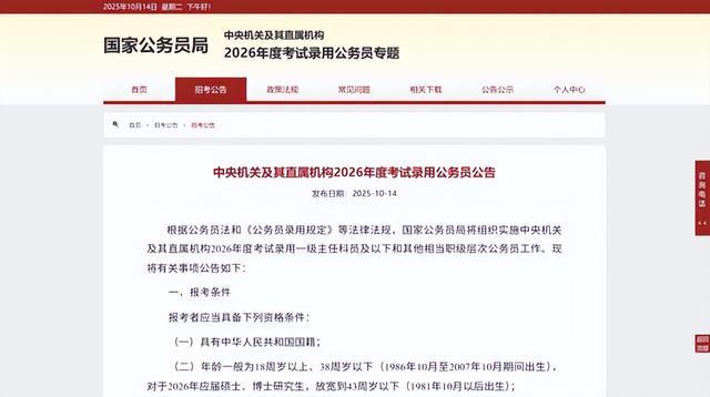 近日,国家公务员局发布《中央机关及其直属机构2026年度考试录用公务员公告》,本次考试录用公务员工作共计划招录3.81万人,考生可于10月15日8:00至10月24日18:00期间,登录“中央机关及其直属机构2026年度考试录用公务员专题网站”(http://bm.scs.gov.cn/kl2026)进行网上报名。