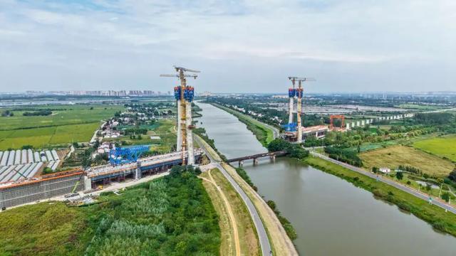沪宁合高铁南京特大桥跨滁河斜拉桥主塔封顶。来源:上海发布