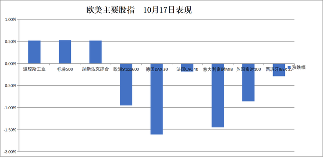 贸易局势缓和希望重燃,美股反弹,三大美股指低开高走,全周累计反弹至少超1%;财报缓解坏账担忧,地区银行股反弹,地区银行指数涨近2%,周四因坏账问题大跌的银行Zions和Western Alliance分别涨近6%和逾3%;信贷危机涉事投行Jefferies涨近6%;芯片指数止步两连阳、但全周涨近6%;甲骨文逆市上涨次日跌近7%。特朗普称减肥药可能降价后,诺和诺德欧股跌超6%。