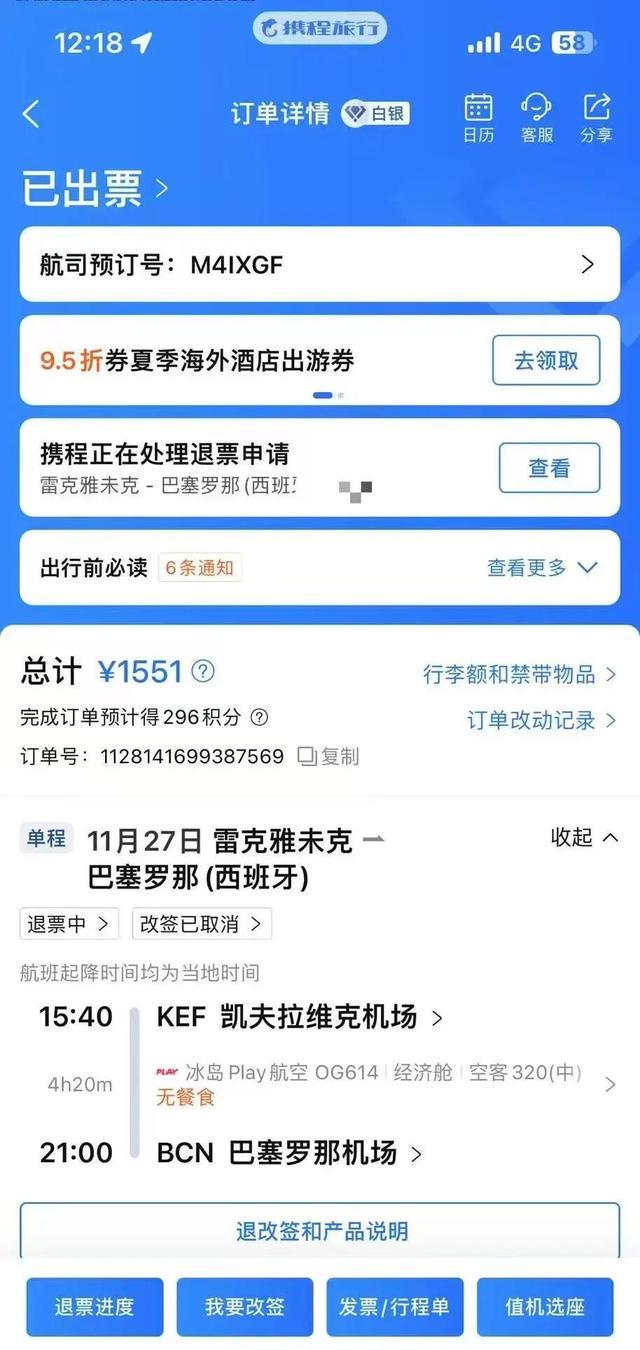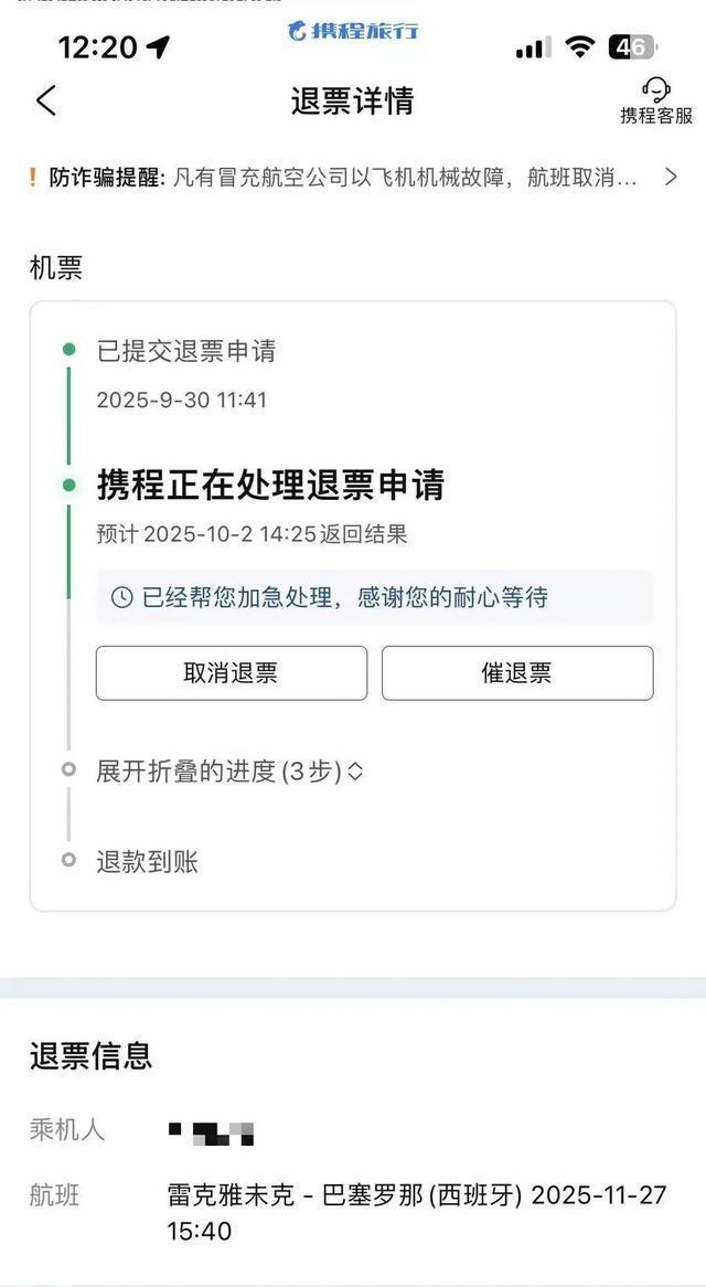 为避免耽误整个行程,吴先生不得不重新订下其他航司的机票。而重订机票,他不仅花费了更多费用,还需到米兰中转,增加了路途耗时。吴先生称,事后他多次与携程方就退费问题进行沟通,但始终无果。“所有的回复都是要跟航空公司(冰岛play航空)沟通,看那边的政策。”吴先生表示,截至目前,他的App后台仍旧显示“携程正在处理退票申请”。