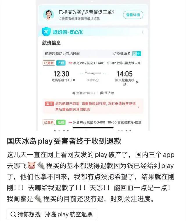 记者也注意到,不少消费者近期在社交平台发帖,称在遭遇“冰岛play航空”破产退票难问题后,部分购票平台已陆续退钱。其中,一网友晒出了自己在去哪儿网的退款截图,称自己此前购买的10月2日巴黎飞雷克雅维克的1739元机票,已全额退款。还有网友在留言区表示,同样是“冰岛play航空”的退票问题,飞猪、去哪儿、携程商旅基本都有退款反馈。