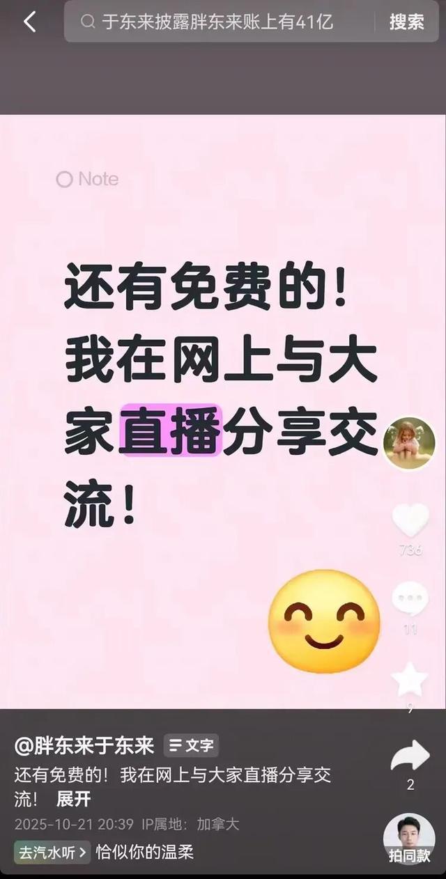 于东来称:“还会有免费的,我在网上与大家直播分享交流。”